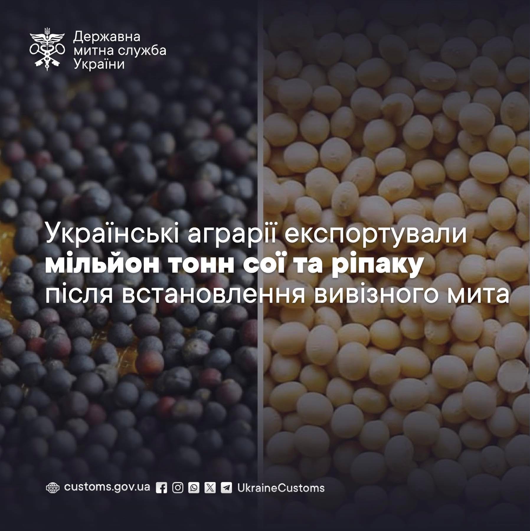 Відповідно до змін, що набрали чинності 4 вересня 2025 року, до Закону України «Про ставки вивізного (експортного) мита на насіння деяких видів олійних культур» запроваджено експортне мито на соєві боби та насіння ріпаку (подрібнені або не подрібнені) у розмірі 10% від митної вартості товарів.