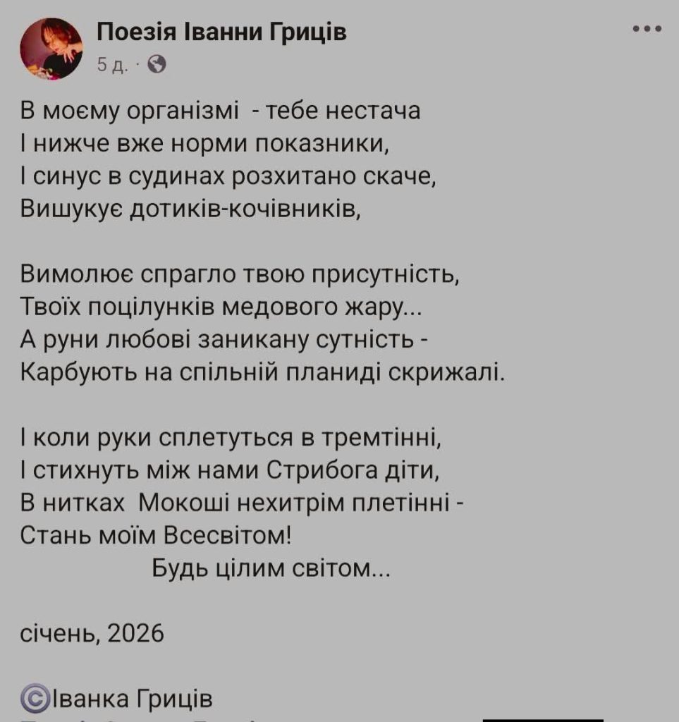 Зрештою, поезія Іванни Гриців — це про пошук гармонії між тілесним і духовним. Це спроба зафіксувати невловиму мить близькості, яка триває лише секунду, але залишається в пам’яті назавжди. Саме тому її твори знаходять такий живий відгук, адже вони говорять мовою, яка зрозуміла всім, хто кохає і відчуває.