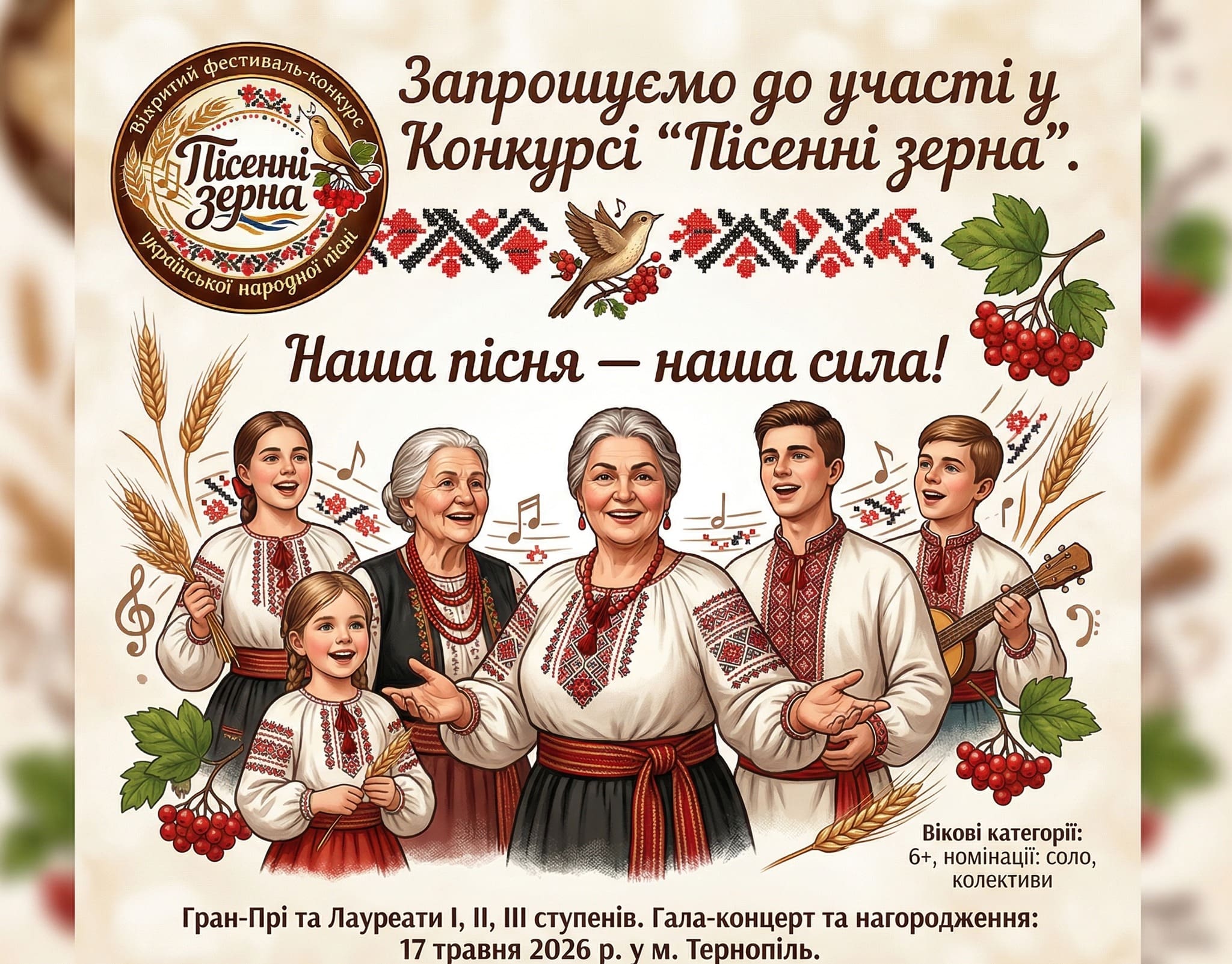 Тернопільщина готується до масштабної культурної події — Відкритого фестивалю-конкурсу української народної пісні «Пісенні зерна». Організатори закликають виконавців з усієї України та закордону продемонструвати силу національного голосу та стати частиною мистецького спротиву.