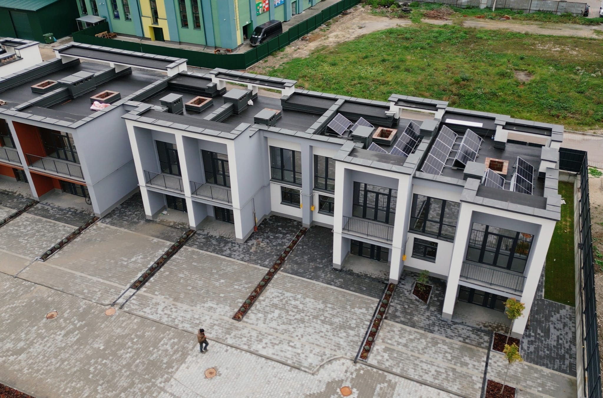 - покрівельні роботи завершено на 100%, на дахах — сонячні панелі для повної енергонезалежності.