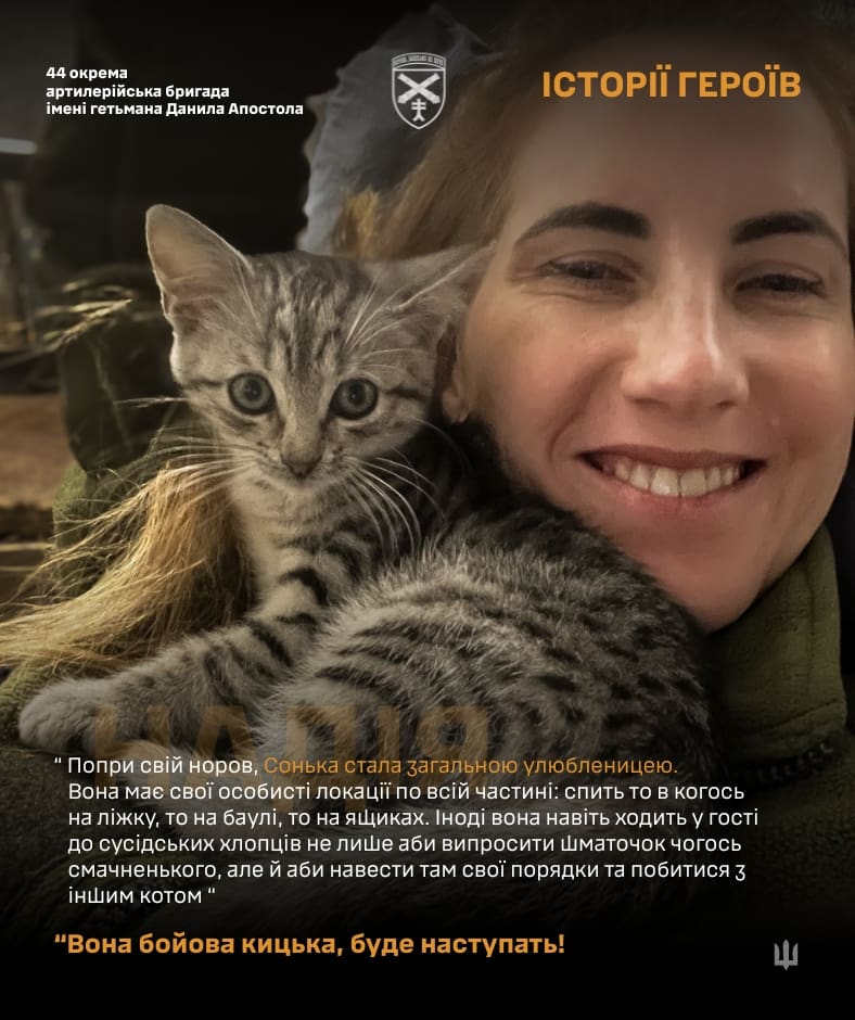 Особливе місце в цій військовій сім’ї займає киця Сонька, яка стала справжньою улюбленицею підрозділу. Кошеня з’явилося в частині ще восени, коли виникла потреба боротися з мишами. Маленька киця швидко виросла й перетворилася на бойову охоронницю, яку Надія жартома називає “наступальною” зброєю.